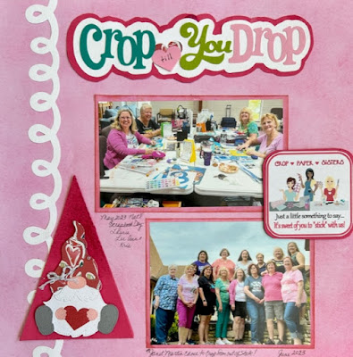 Isn't this gnome adorable? My friend, Katie Botsford made it as my welcoming gift box of goodies for our Crop Paper Sister's crop several months ago. Well, I cut it down and used the rest of the box as the background for the title and the mat for the decal of our logo. The swirl was on our "free table" and the papers are from many many years ago by a company called, Making Memories in Fushia. The pics are of us at the crop on National Scrapbook Day and of the group when a past member attended from out of town and we managed to get a pic! We almost forgot to take one!!!! Doesn't that sound funny!! But true! Enjoy the layout!!