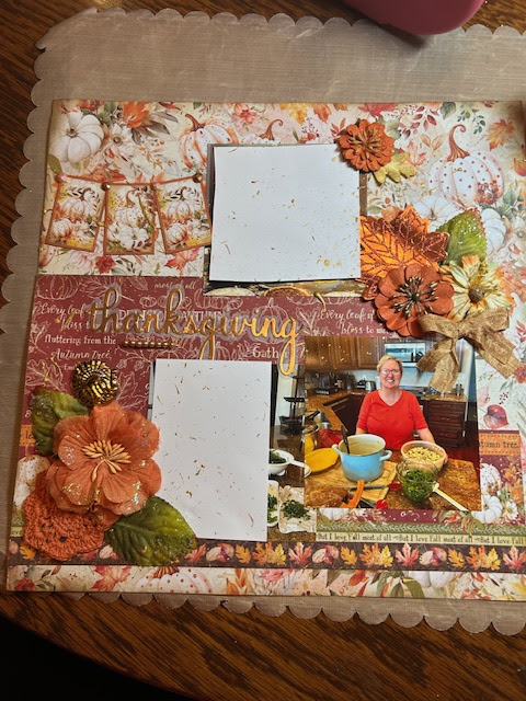 Used the new Graphic 45 Autumn Greetings papers: Thanks & Giving, and Pumpkin Patch. Inked edges with Walnut ink and a blending tool. Lots of things from my stash: Prima Marketing flowers and leaves, and crochet piece, foil leaf, metal turkey drink stick, little pearls stitched onto layout, "Thanksgiving" die cut from Pinkfresh Studio Happy die set used with copper cardstock and silver vellum, Gold seam binding tied into bow, and little metal acrylic dots from Prima Marketing. Happy Thanksgiving everyone!!